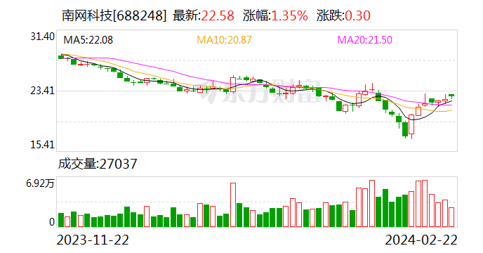 南网科技(688248)2月22日晚间发布业绩快报,2023年实现营业总收入25.37亿元,同比(调整后)增长41.77%;净利润2.81亿元,同比增长36.71%;基本每股收益0.5元。报告期内,公司跨区域发展成效显著,新收购贵州创星电力科学研究院有限责任公司、广西桂能科技发展有限公司带来了业务增量,公司经营规模进一步扩大。