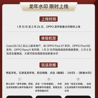 我看OPPO还挺会来事,1月底就火速上线了新春水印,陆续推送给OPPO机主(需保证版本为ColorOS 13.2及以上),保证大年三十之前,机主们都能用上!这可太贴心了,看着这水印就喜庆,用来发朋友圈很应景啊。
